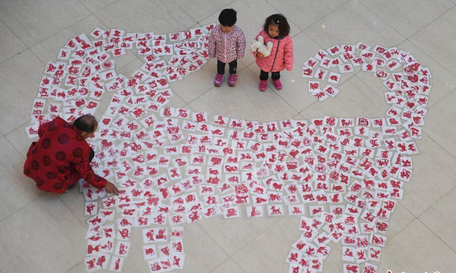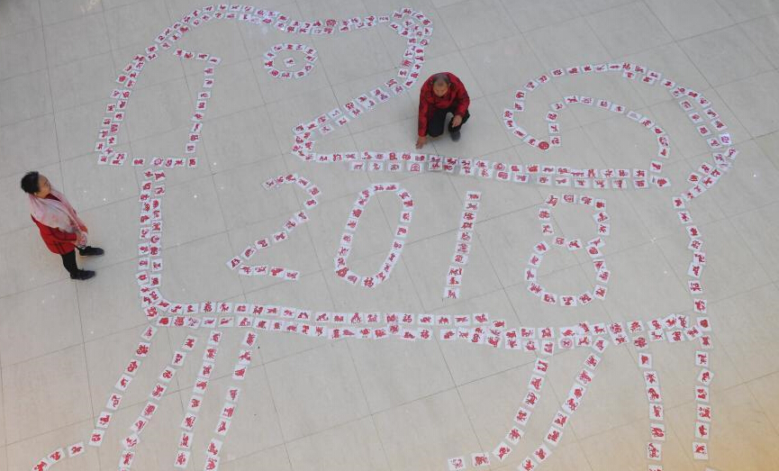 12月26日,濟南民間剪紙藝人用數百只形態(tài)各異的剪紙“狗”拼“瑞狗迎新”圖。圖為濟南67歲剪紙藝人徐建剪2018只“旺旺狗”迎新年。