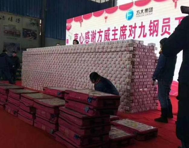 1月26日,江西,一段方大集團九鋼“現金墻”的視頻在網(wǎng)上熱傳,視頻中,紅地毯上是一疊疊百元砌成的“現金墻”,后面懸掛著(zhù)一條橫幅,上面寫(xiě)著(zhù)“衷心感謝方威主席對九鋼員工的深情厚愛(ài)”。有網(wǎng)友評論道,此刻希望自己就是九鋼人。