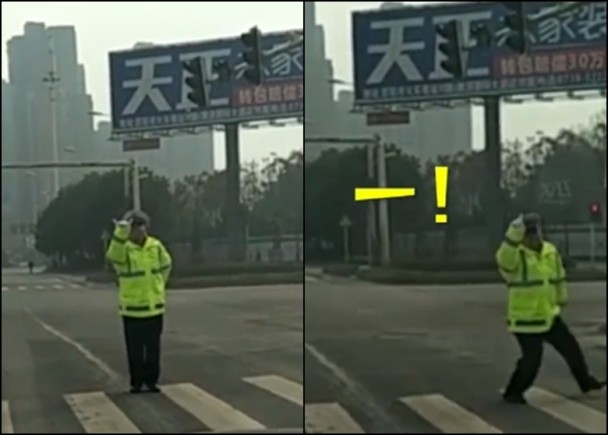 了解到,該名交警站在斑馬線(xiàn)上不斷做手勢,為免司機未有注意,更一邊做手勢,一邊晃動(dòng)身體。倒數僅余四秒時(shí),交警開(kāi)始慢慢步向路邊,但仍不忘比手勢。待「一」的手勢過(guò)后,他剛好站在路邊,讓司機順利通行。