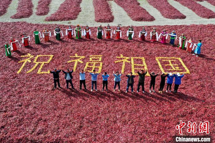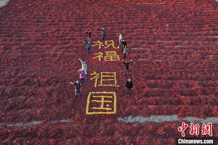 秋高氣爽,艷陽(yáng)高照,素有“辣椒之鄉”的新疆博湖縣,又迎來(lái)了一個(gè)豐收季;鸺t的辣椒鋪滿(mǎn)了整個(gè)晾曬場(chǎng),在一望無(wú)際的金秋田野上顯得十分耀眼。當地村民用豐收的辣椒和玉米擺成“祝福祖國”“歡度國慶”等圖案慶祝國慶。